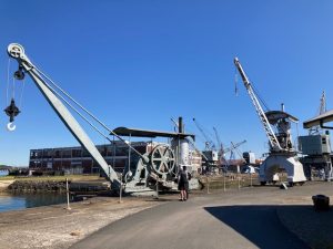 Cockatoo Island walk 7 Aug – walkers attempting to operate steam powered crane by Julie McDonald | Aug 10, 2024